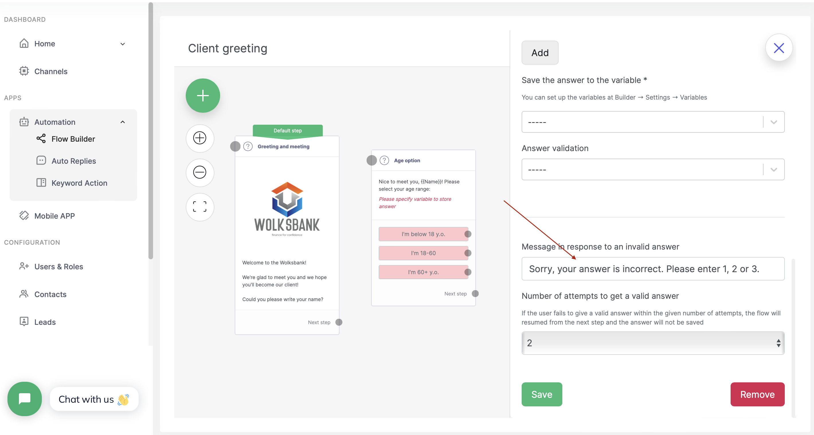 **Note:** this step requires saving the answer in a variable, but since we don't need it, we'll choose the option with a dash. Below we've entered a message that the user will see if he enters the answer incorrectly.