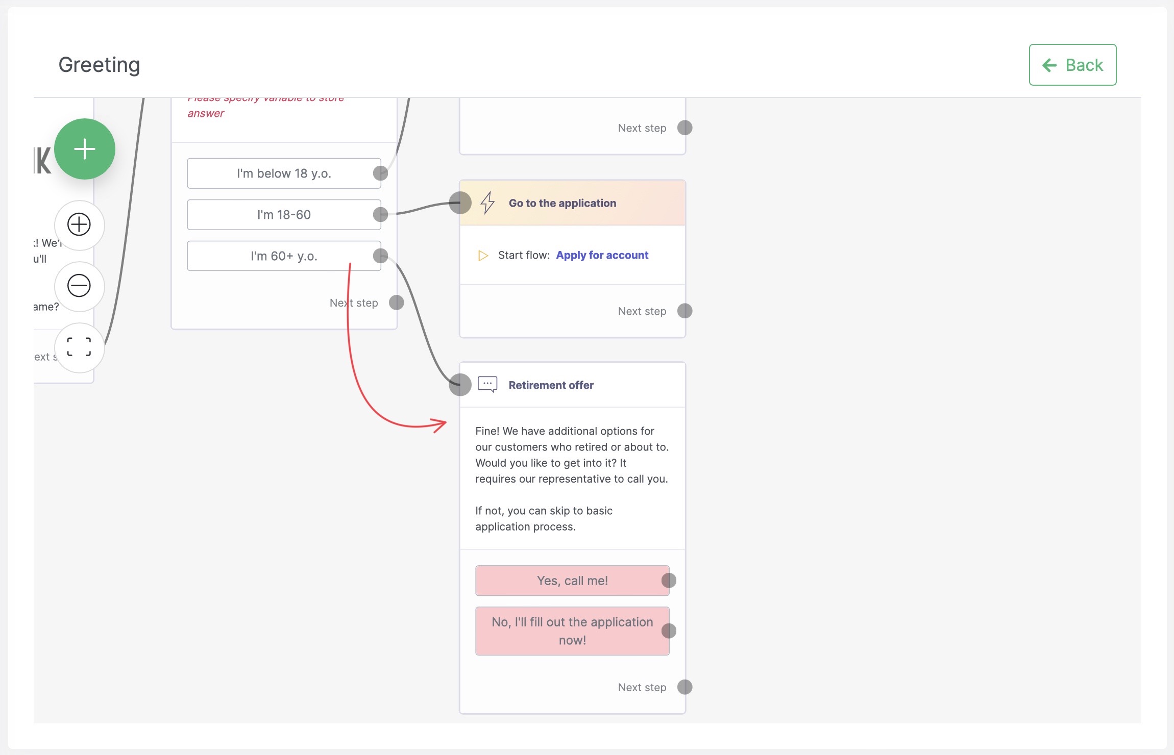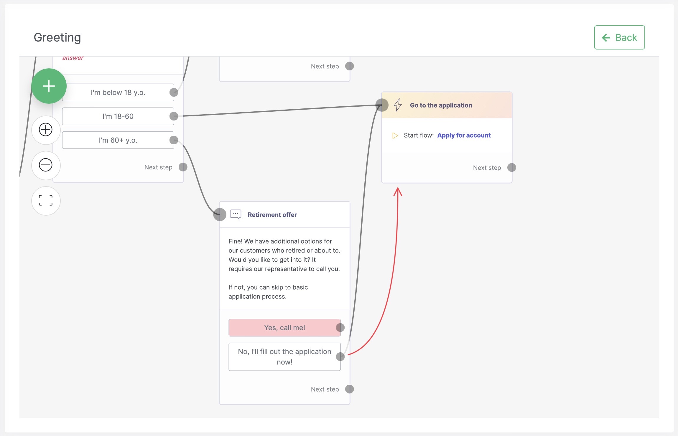 Making a connectionNote right away that the second choice leads the candidate to the same place as the '18-60' category, that is, to the application process. So let's connect the second answer to the 'Go to the application' step: