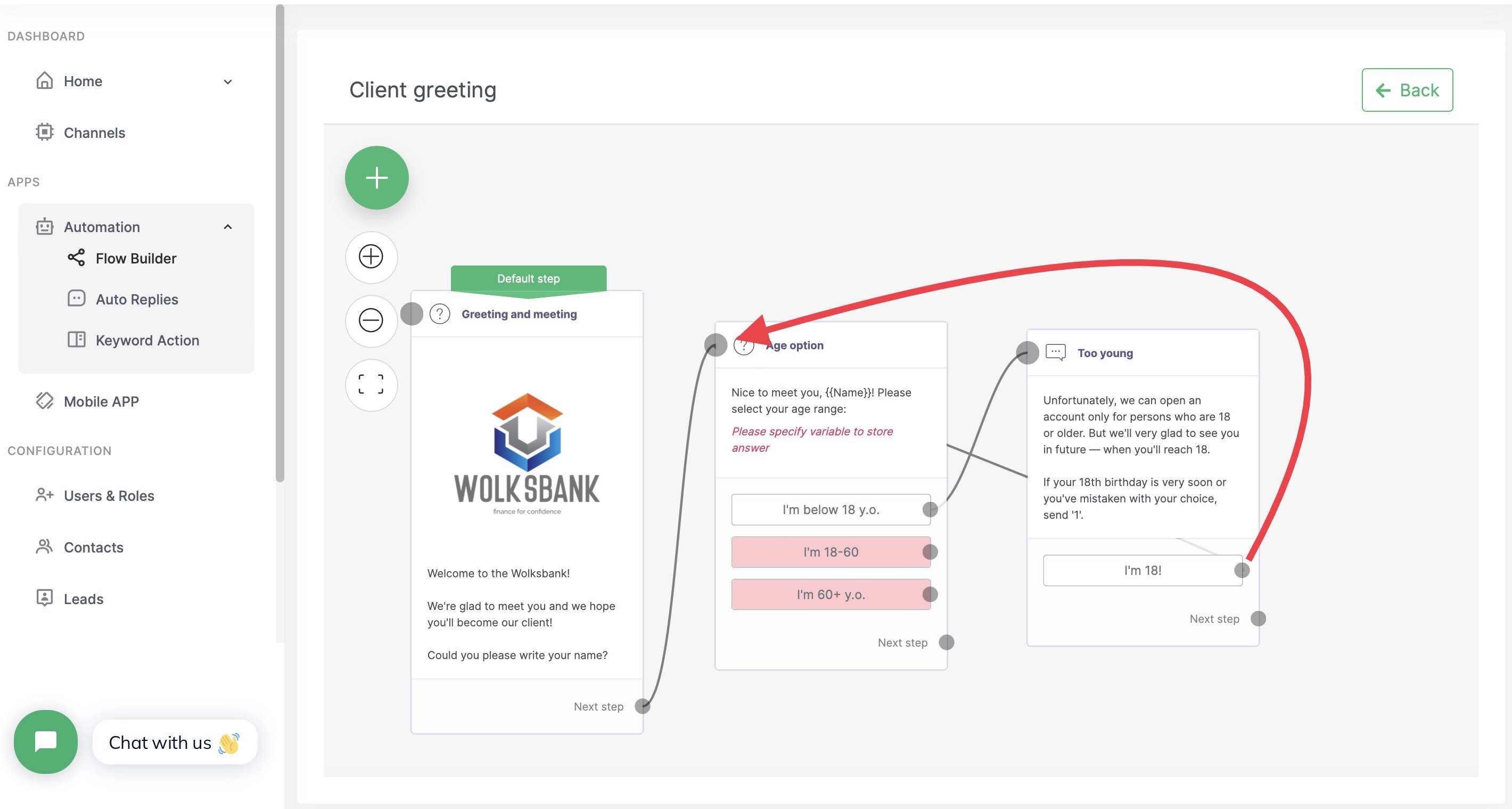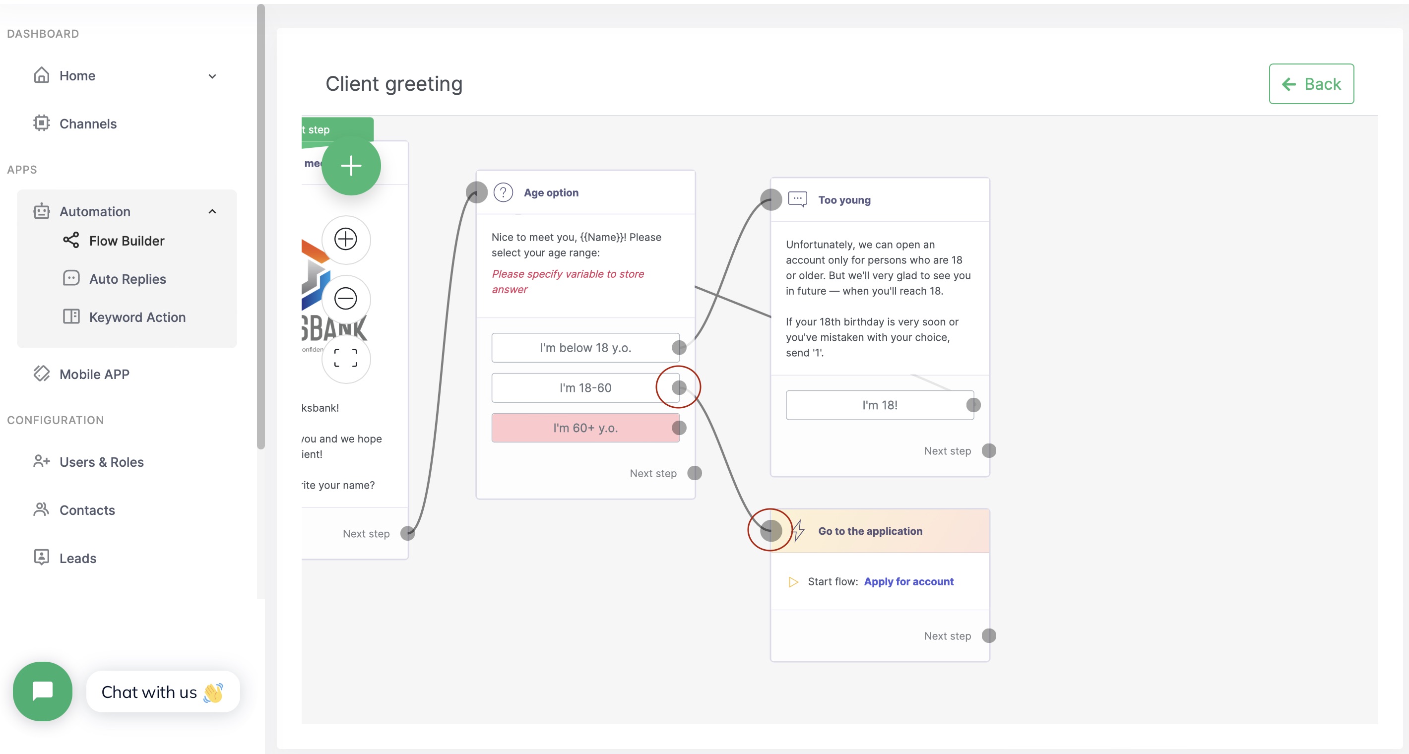 We work in a bank, and want to automate the application process for opening a bank account. We will first greet the potential client, ask his name, and make sure that he meets the age requirement. In addition, if our client is over 60 years old, we'll offer him a special pension program and if he agrees, we will save the lead for the bank representative.