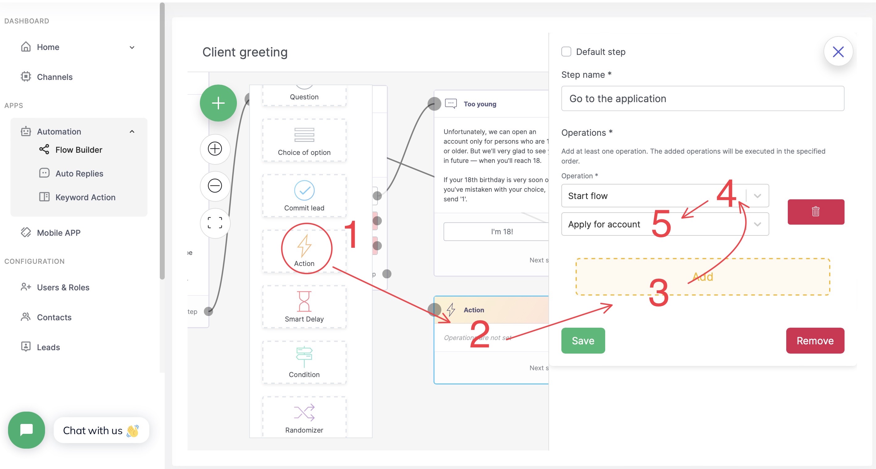 Next, let's deal with candidates in the 18-60 category. We'll immediately switch them to the application flow (we called it 'Apply for account', remember?). To do this, we do the steps as follows: