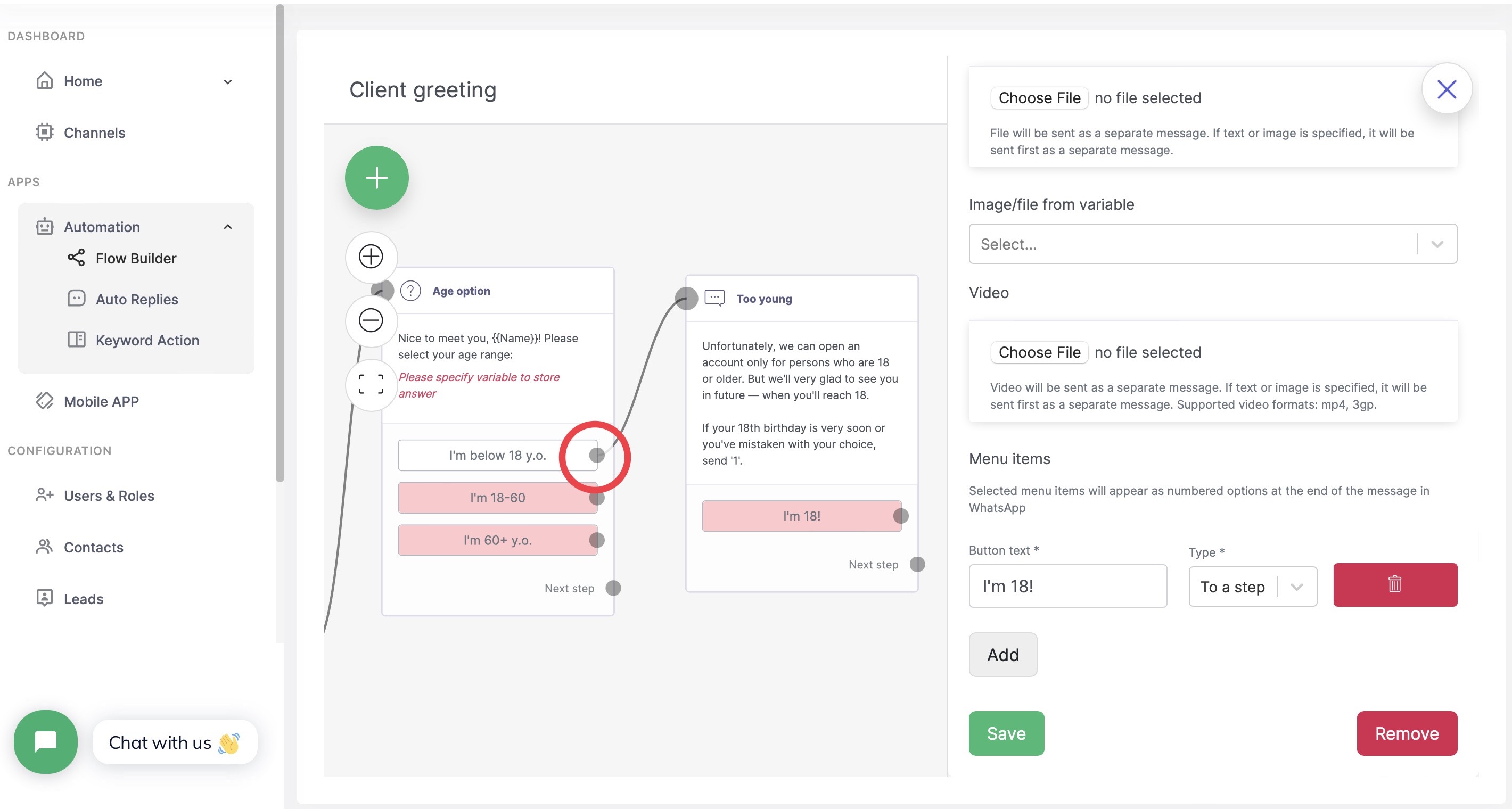 As you can see in the screenshot, we have linked the 'I'm below 18' menu item with the 'Too young' step. This menu item is no longer colored red, unlike the others, which don't lead anywhere yet.Let's create another link by connecting the 'I'm 18!' button to the 'Age option' block so that our candidate can re-enter the selection:
