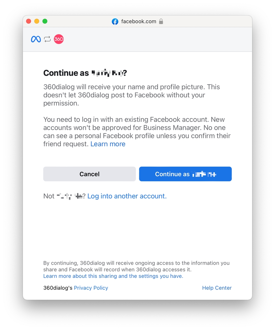 Aparecerá una ventana para confirmar que 360 Dialog está vinculado a tu cuenta de Facebook. Ten cuidado, la cuenta de Facebook autorizada debe coincidir con la cuenta que has configurado para tu empresa. Si la cuenta de Facebook autorizada no es la correcta, aparecerá un enlace para cambiarla. Si todo es correcto, haz clic en "Continuar con Facebook" y confirma el enlace a tu página de Facebook.