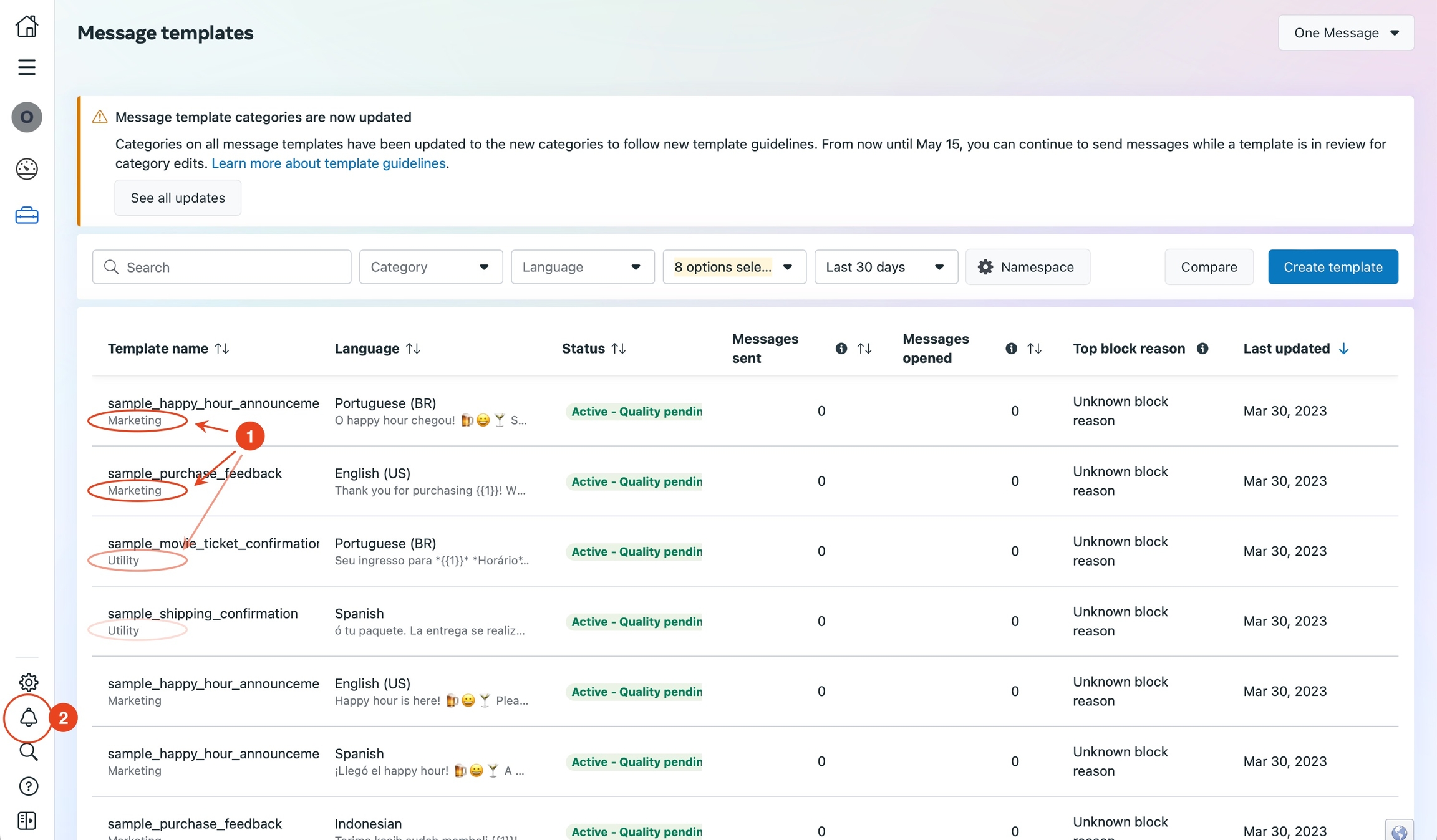 Para comprobar el resultado de la categorización automática de las plantillas existentes, consulte el Gestor de WhatsApp. Puede ver las nuevas categorías de plantillas (1) en WhatsApp Manager. Para comprobar el resultado de la categorización automática, vaya al centro de notificaciones (2):