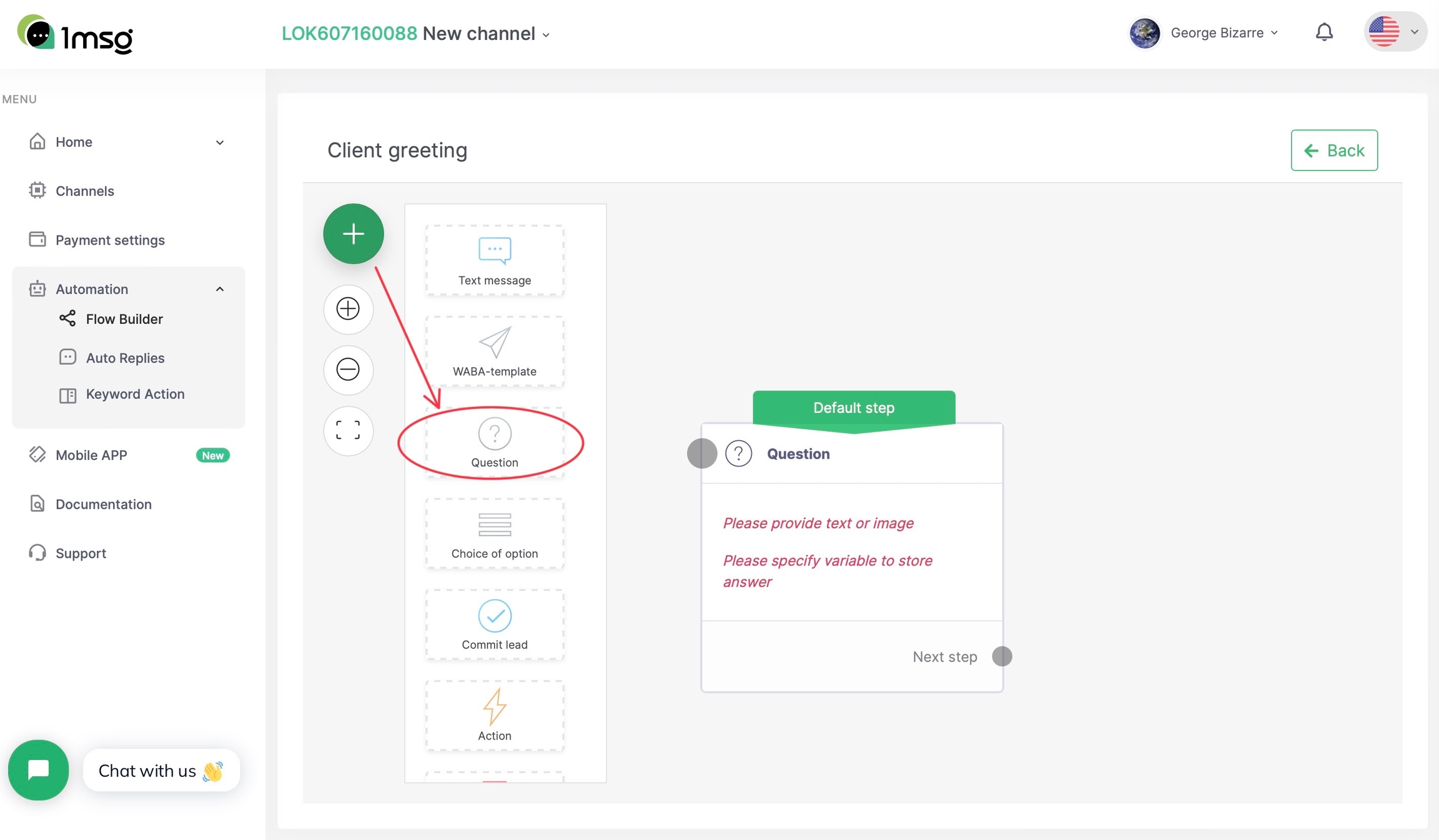 So, let's go into the 'Client greeting' flow and create the first step. Since we want to ask the client a question and save his answer, we select the 'Question' step type.