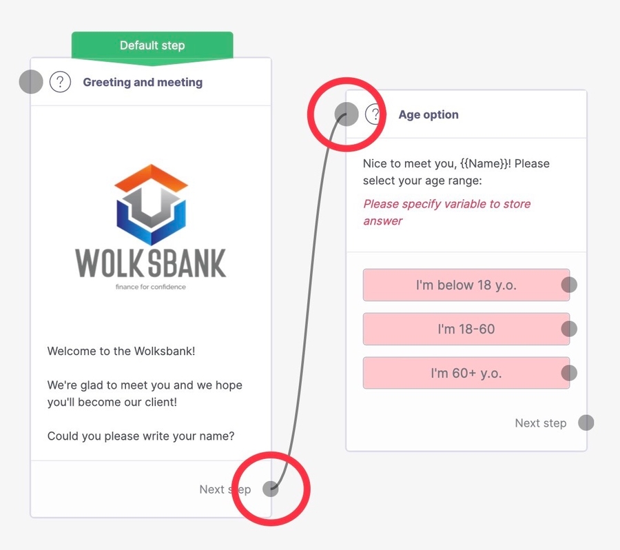 As you can see in the screenshot, we have linked the 'I'm below 18' menu item with the 'Too young' step. This menu item is no longer colored red, unlike the others, which don't lead anywhere yet.Let's create another link by connecting the 'I'm 18!' button to the 'Age option' block so that our candidate can re-enter the selection: