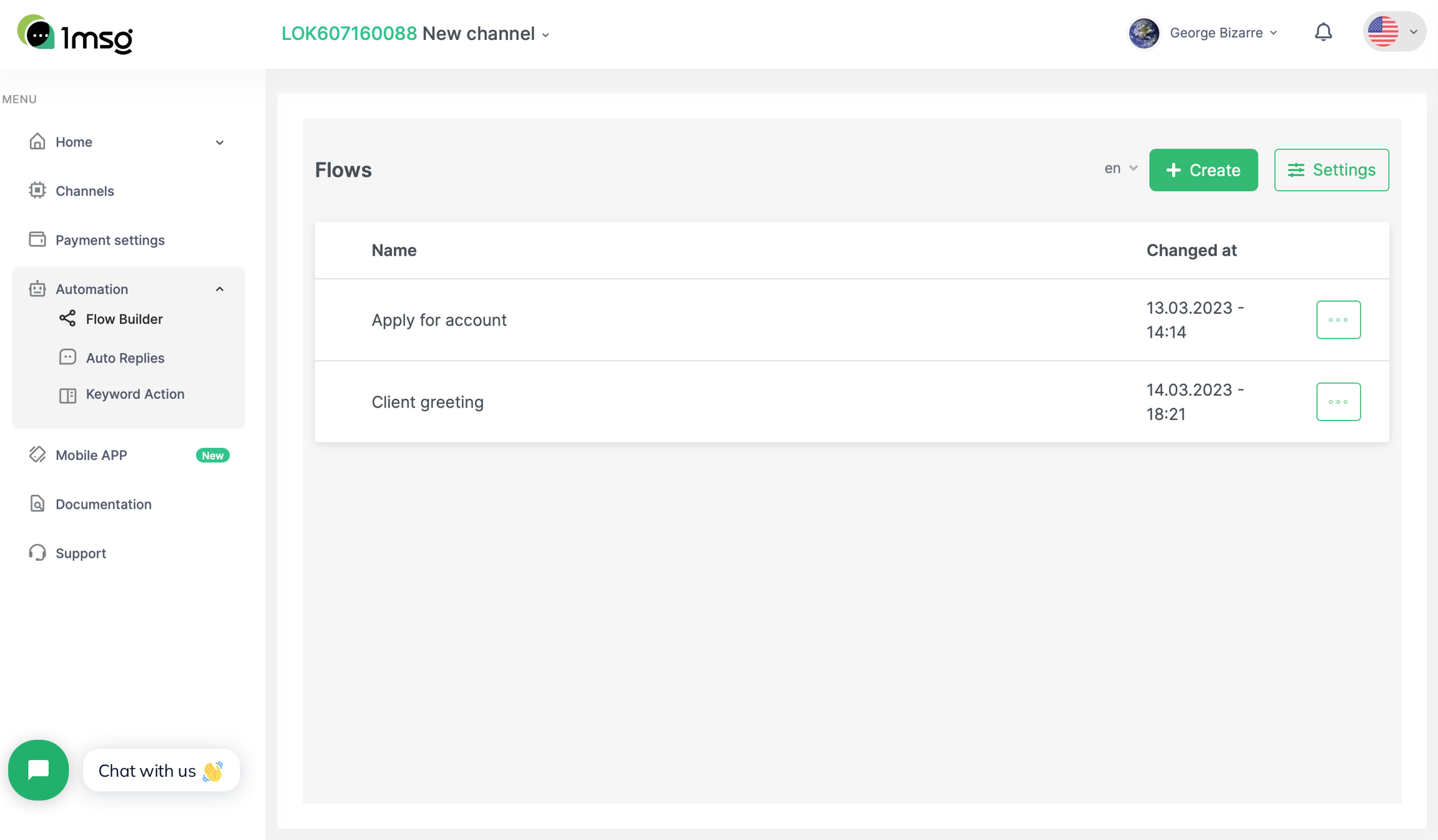 In the list of flows, we created two scenarios (we call it 'flows'). One we called 'Greeting', it will contain the instructions for the bot, which we described in the diagram above. The second one is 'Apply for account':