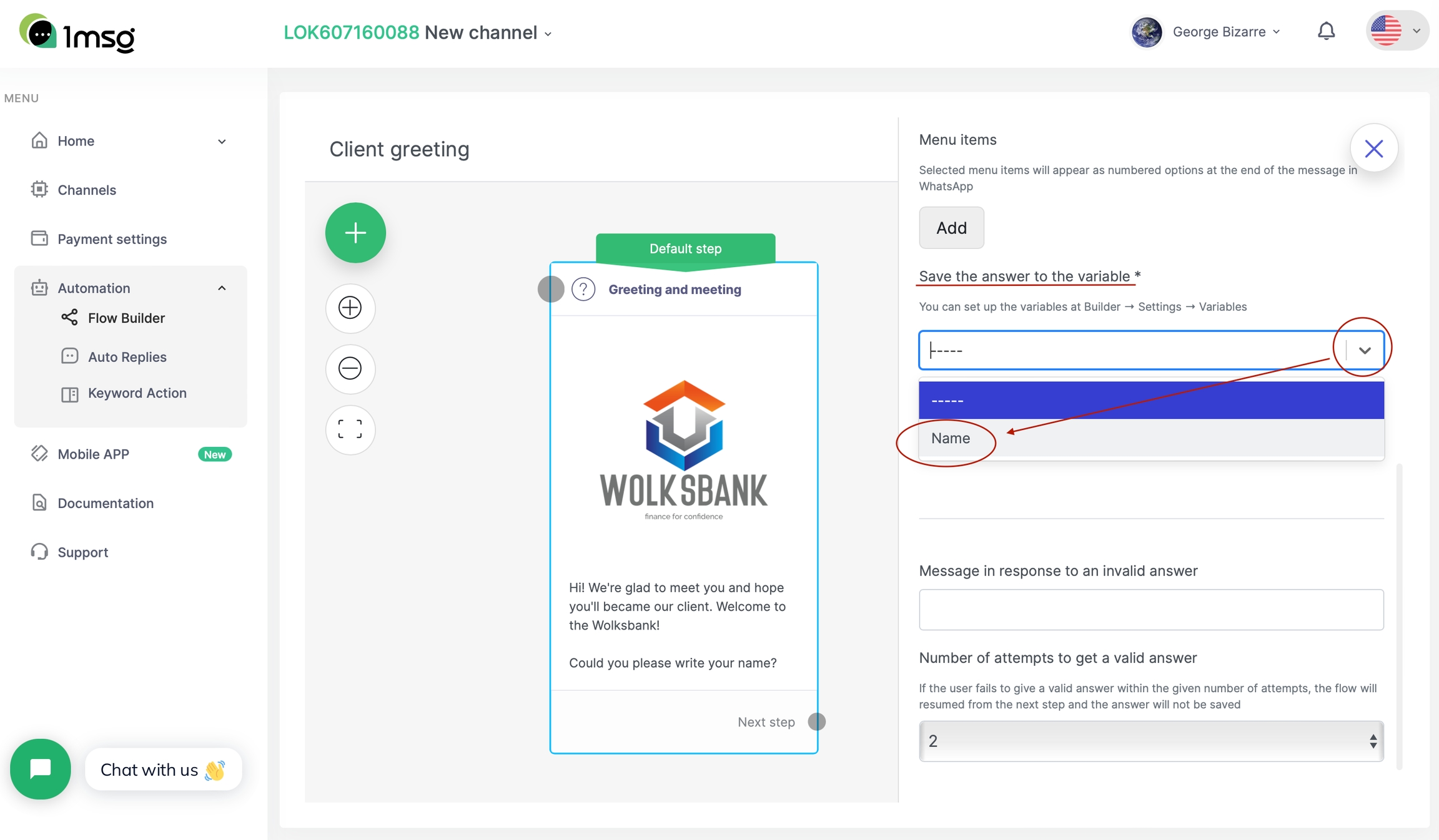 By design, this step should greet the potential customer and save his name after the answer. We discussed the creation of the step in the previous article, it shouldn't cause any difficulties. If you need to revise, refer to it out again.