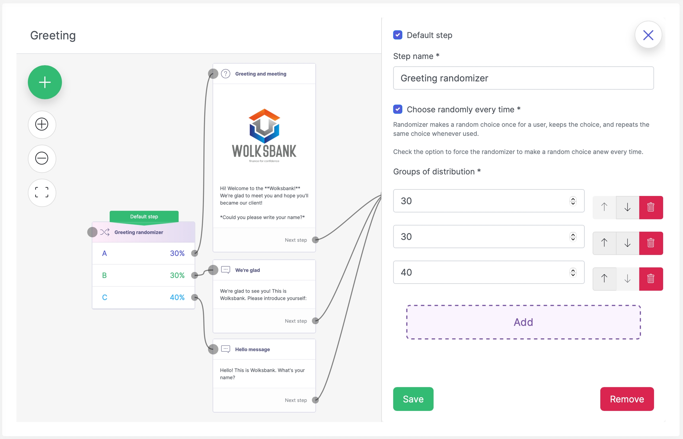 Let’s say we want to diversify the greeting sent to clients and decided that we will have three variants. In order do this, we need to create a randomizer block with three options in front of the greeting blocks. The flow fragment will look as follows: