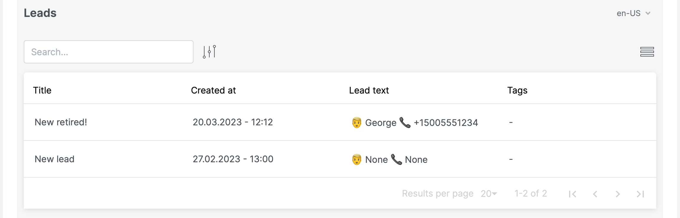 Saves a request from the user, e.g. when a customer wants to contact customer service or has agreed to a sales call. The block can be added in the usual way from menu (1). The result is recorded into a table accessible through the Leads menu item of your 1msg.io account (2). The data from the table can be exported to an MS Excel file to be processed by your company staff: