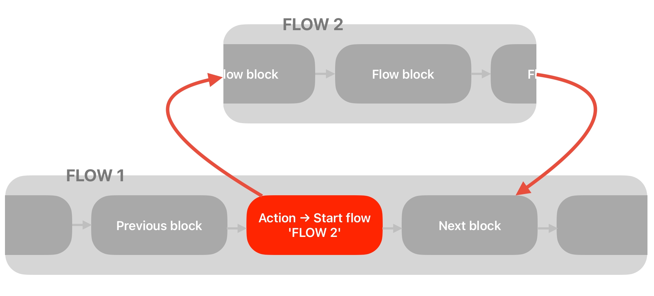 This operation executes one of the other flows (which you have in your Flows list). Once executed flow is complete, the user returns to the one from which the transition was made from the Action block (the next block after the Action will be executed)—if the parent flow has not been stopped:
