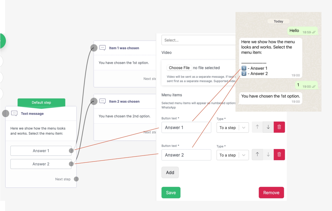 The menu is added to the Menu items. Below you can see how the menu is set up and what it looks like on the screen of the user's device. In the screenshot, the user selects Menu item 1 (sending '1') and gets a response from the "Item 1 was chosen" block, with which the 'Answer 1' button is connected: