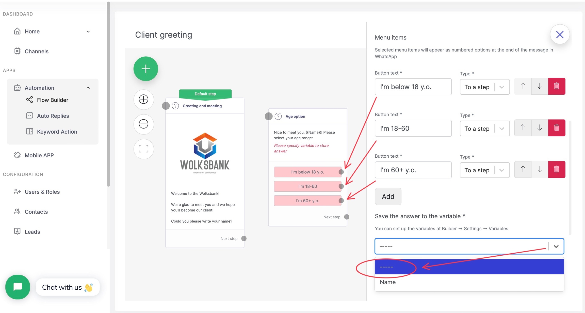We work in a bank, and want to automate the application process for opening a bank account. We will first greet the potential client, ask his name, and make sure that he meets the age requirement. In addition, if our client is over 60 years old, we'll offer him a special pension program and if he agrees, we will save the lead for the bank representative.