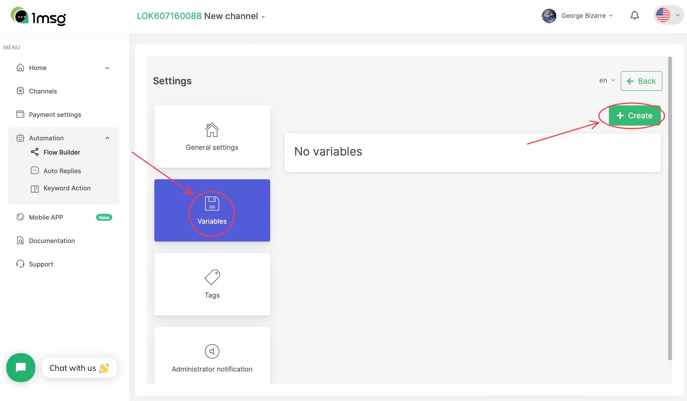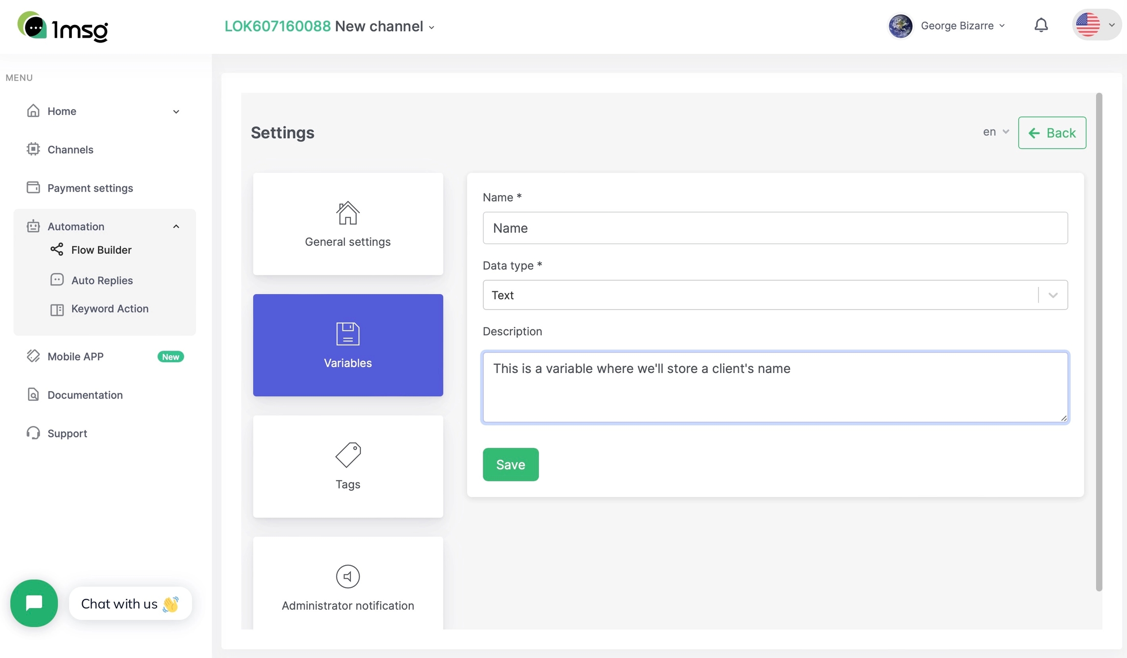 We mentioned a variable in which to save the name. It has to be created beforehand in the script settings section. To do this, go to the menu Automation → Flow builder → Settings → Variables.