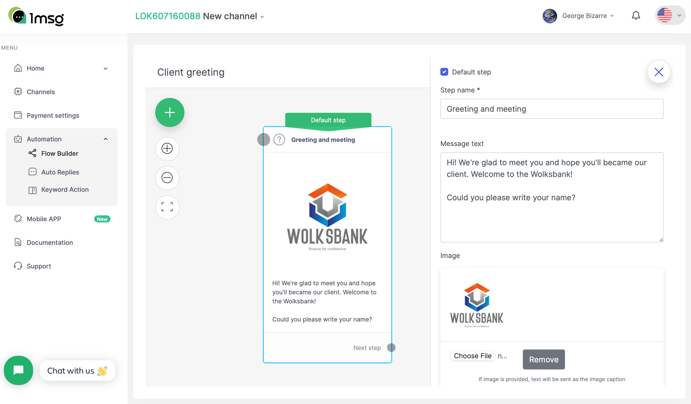 As you can see, we can upload an image so that it appears with the greeting. To do this, click on 'Choose file' under Image and select a picture. We will upload the logo of our imaginary "bank".