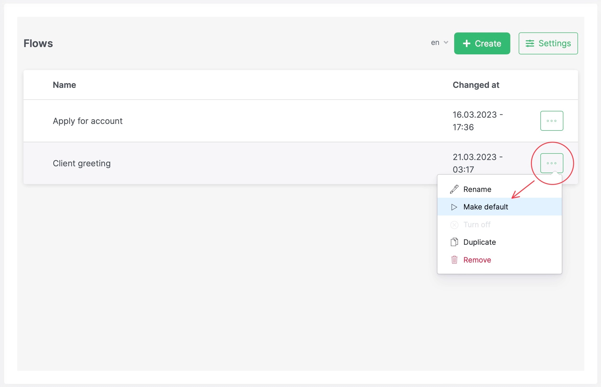 Note: none of our flows are active as shown on the screenshot above. In other words, they will not be executed. To enable the flow mark it as 'Default':​