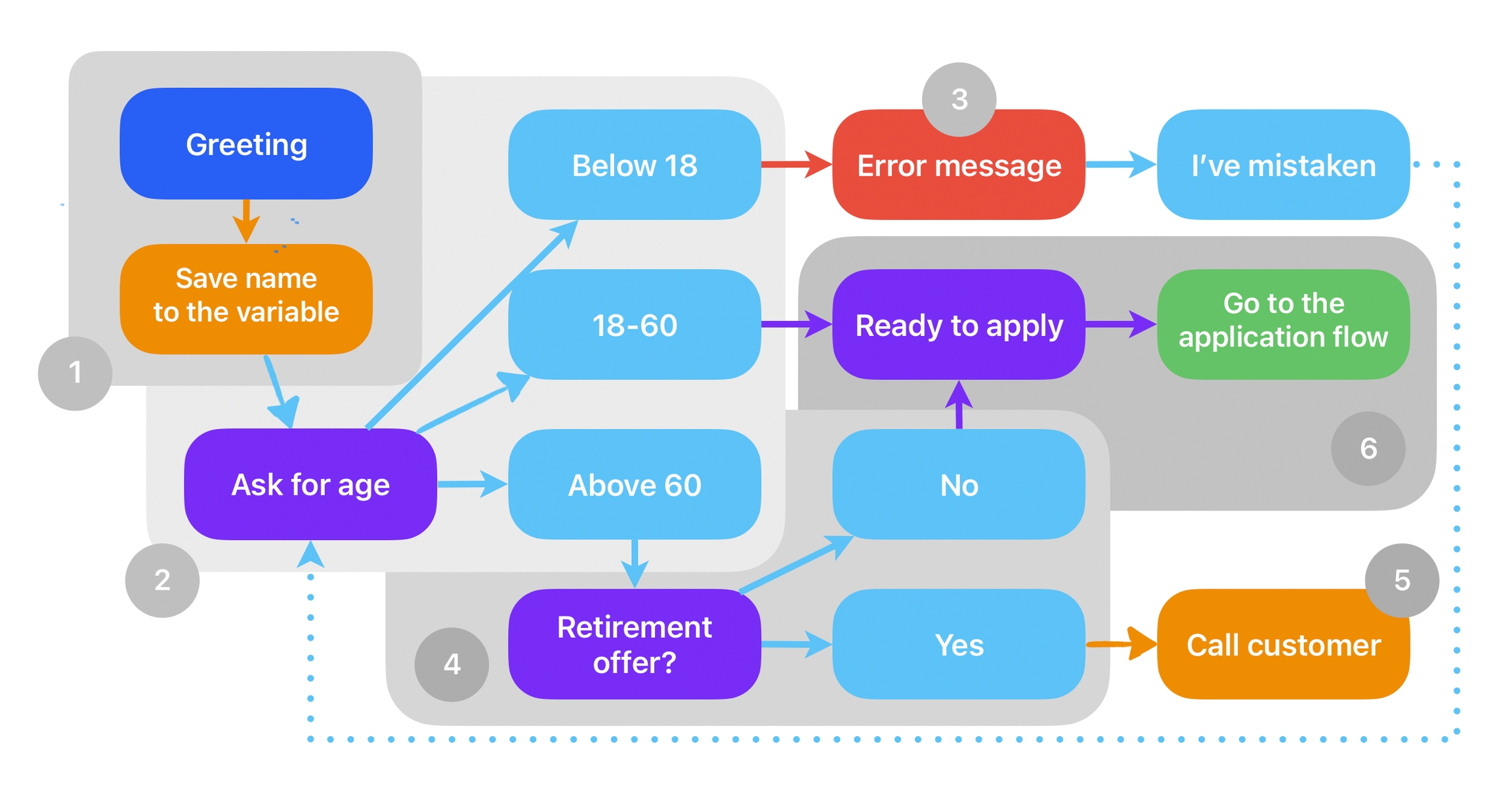 Next, let's deal with candidates in the 18-60 category. We'll immediately switch them to the application flow (we called it 'Apply for account', remember?). To do this, we do the steps as follows:
