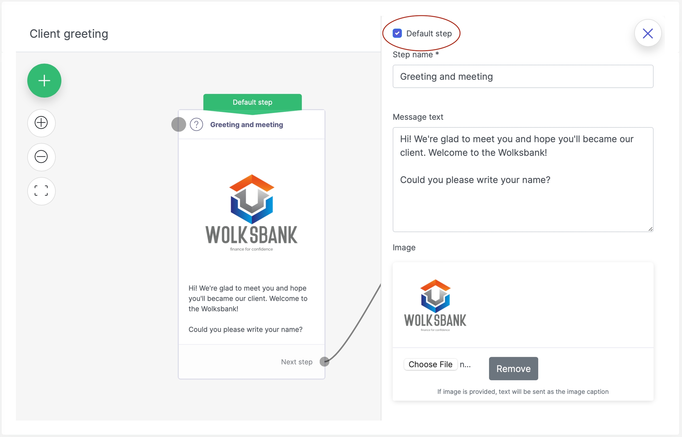 Как видно на скриншоте выше, блок «Приветствие» имеет зеленый маркер в верхней части. Если его нет, установите флажок «Шаг по умолчанию», как показано на рисунке, и сохраните настройки блока (прокрутите панель настроек шага вниз и нажмите «Сохранить»).