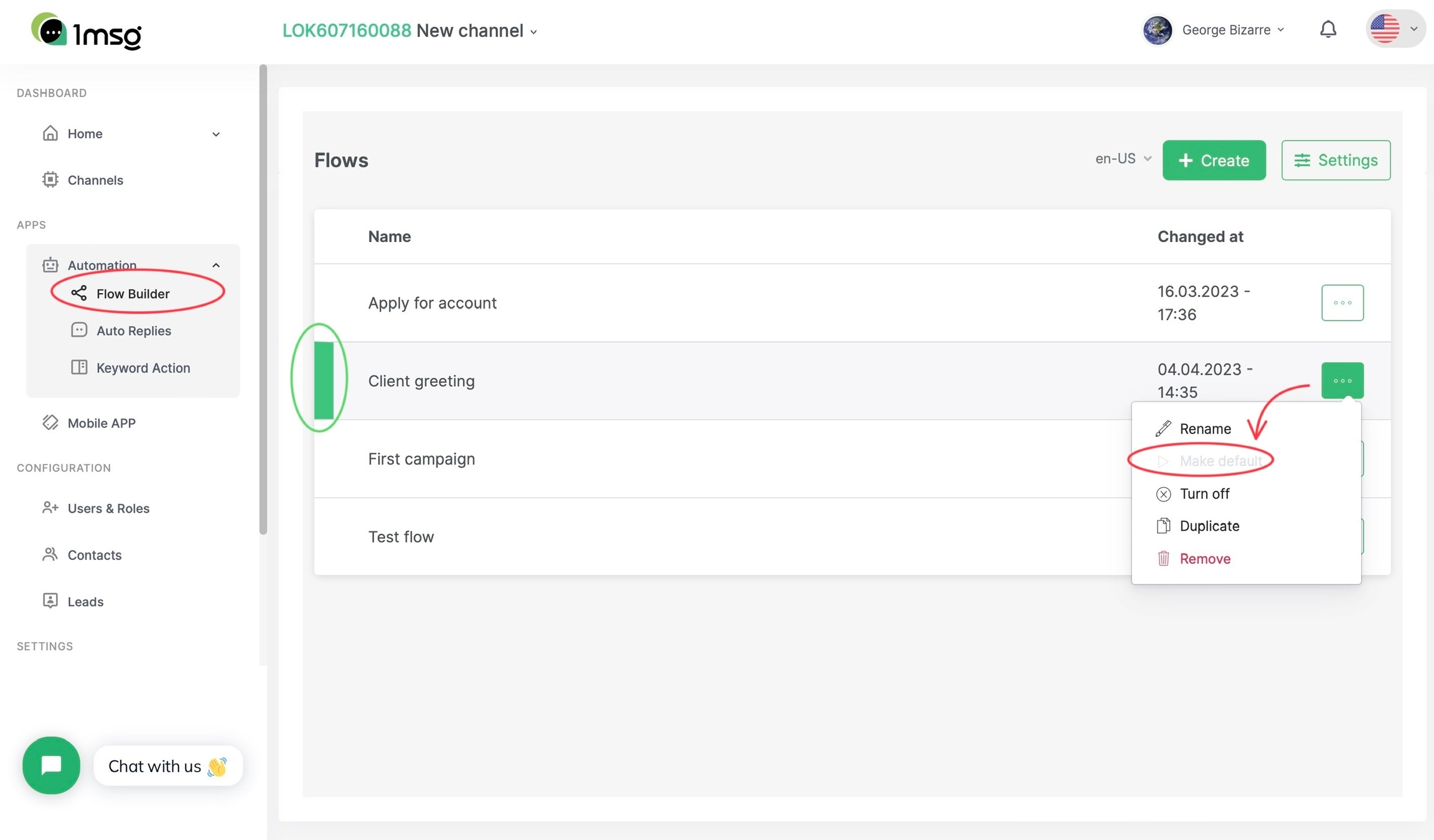 Это можно проверить в списке Сценариев. Один из потоков должен быть отмечен зеленой линией - это сценарий, который будет выполняться по умолчанию. Выберите "Конструктор ботов" → "Сценарии", затем нажмите кнопку с многоточием справа от названия сценария и выберите "Сделать стартовым. В примере ниже эта опция недоступна, поскольку поток уже выбран по умолчанию и отмечен.