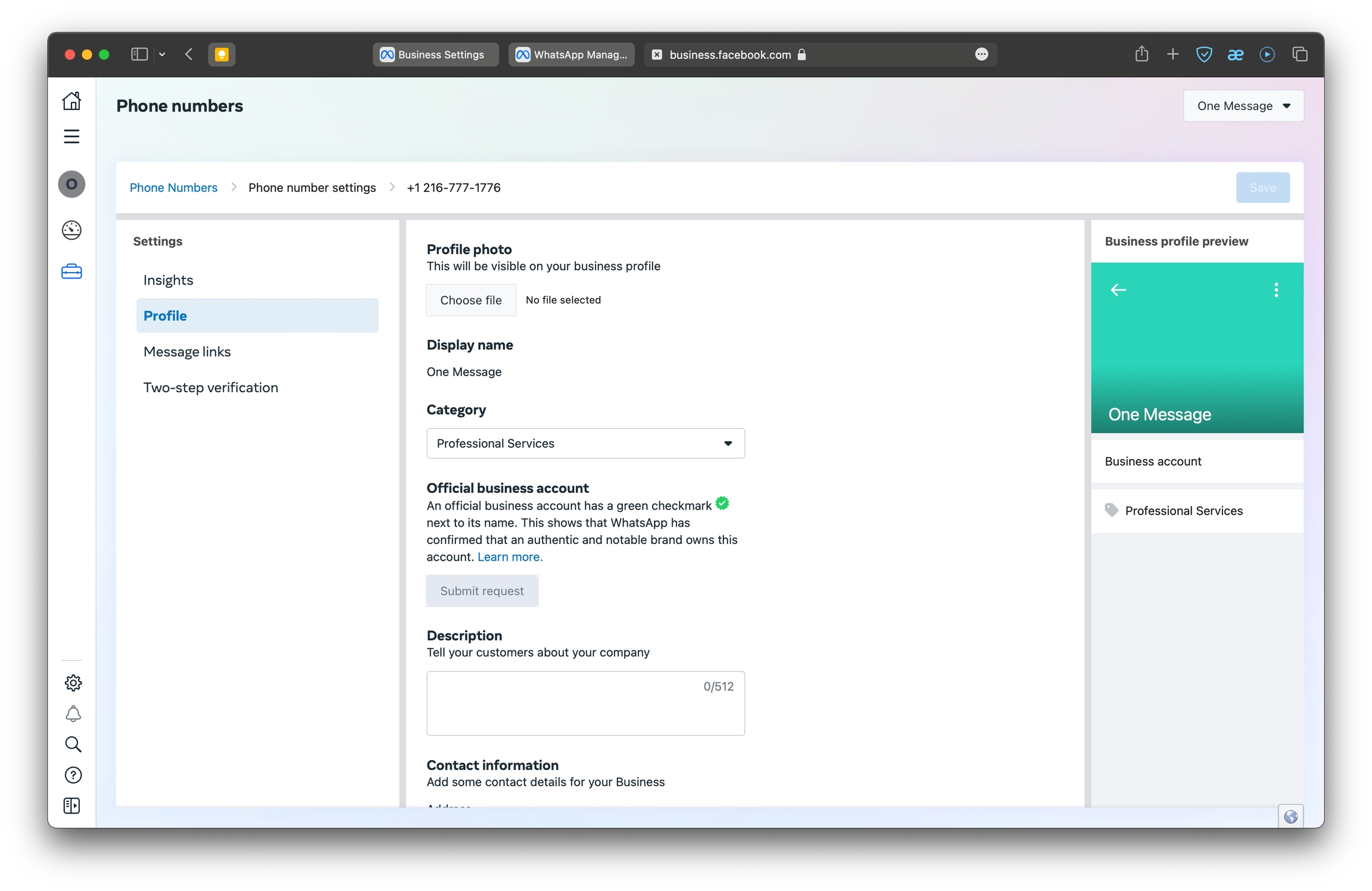 Пройти проверку отображаемого названия бизнеса в WABA;