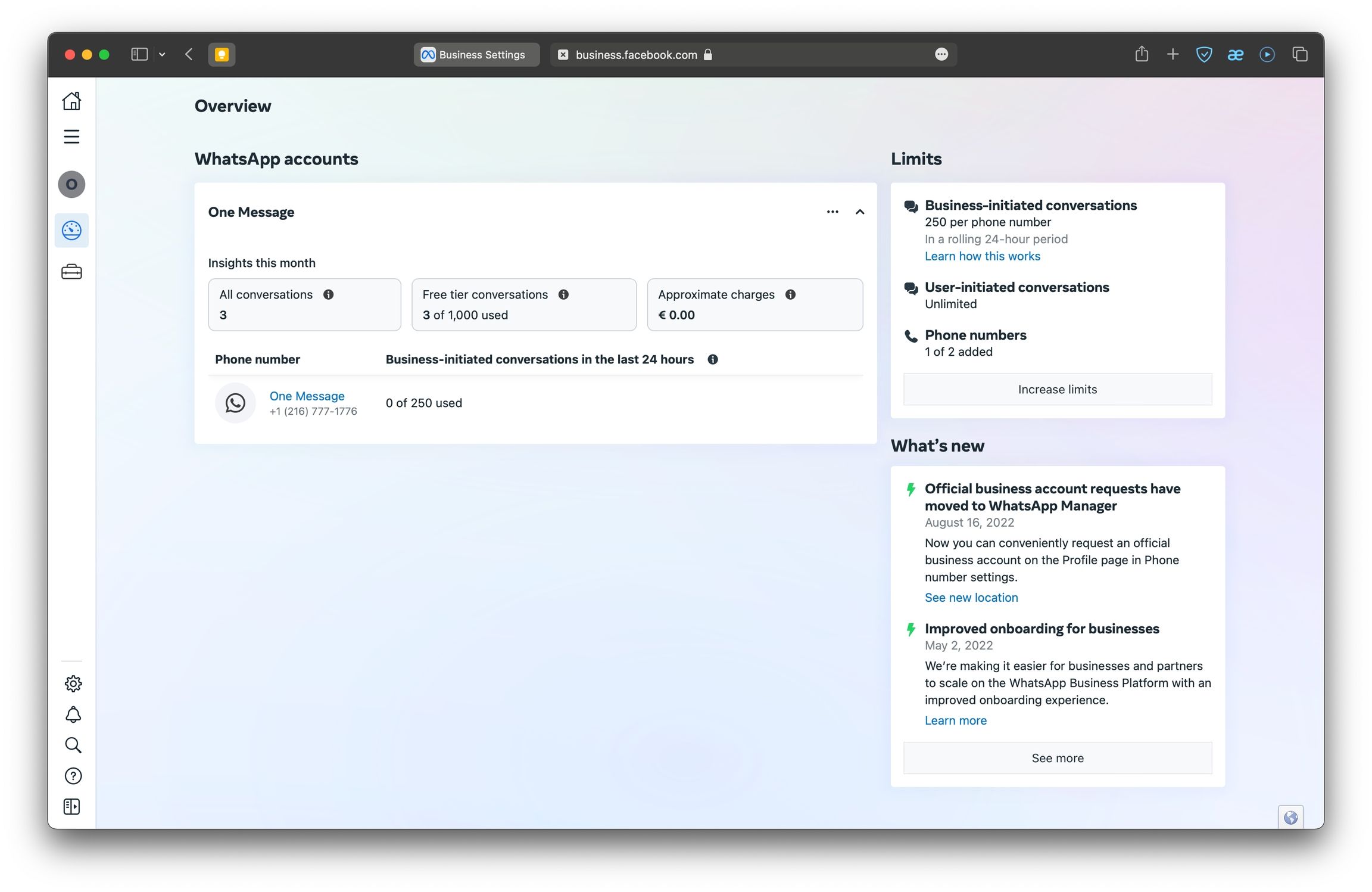 Вы можете сделать запрос непосредственно из WhatsApp Manager. Перейдите в Meta Business Account settings → 'WhatsApp Accounts" → выберите учетную запись → нажмите вкладку «Settings», а затем кнопку WhatsApp Manager.